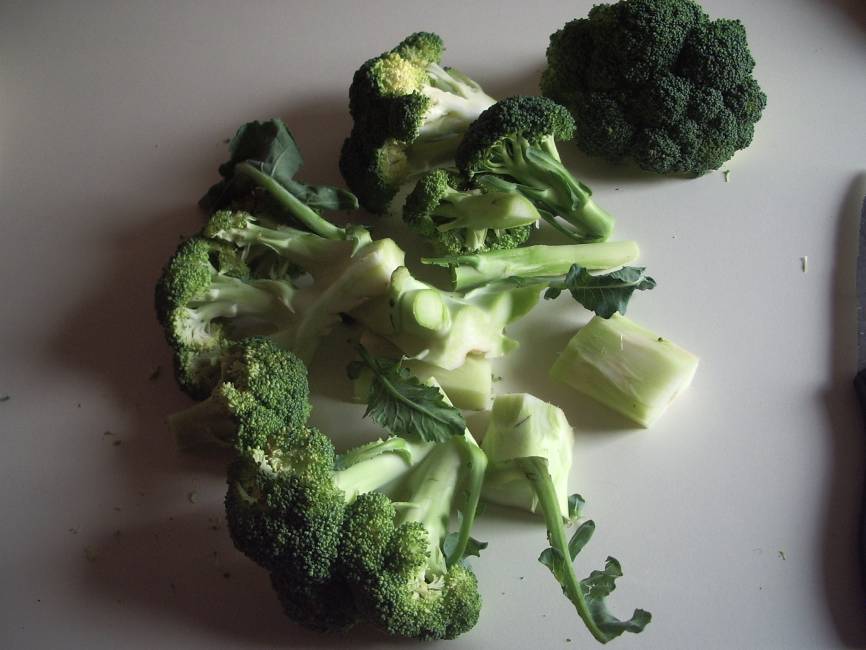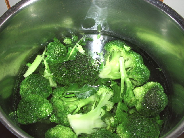2-Quando l’acqua bolle unire i pezzi di broccolo e il sale (un cucchiaino da caffè colmo). Far bollire piano per dieci minuti/un quarto d’ora circa (controllare con la forchetta la cottura); se il fuoco è troppo alto il broccolo si sbriciola.