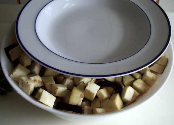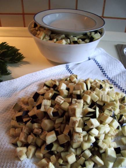 Preparare le melanzane rimanenti e procedere a metterle sotto sale. Far asciugare quelle lavate su un canovaccio. Preparare l’olio per friggere in una casseruola. Metterci dentro un dadino di melanzana asciutto e si capirà quando l’olio è pronto per friggere.