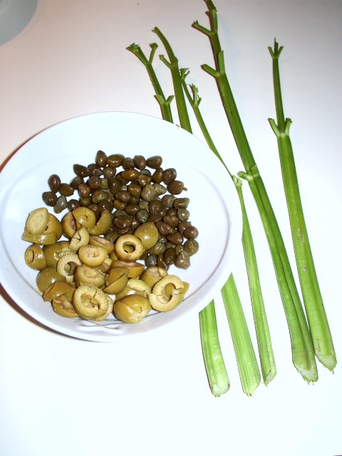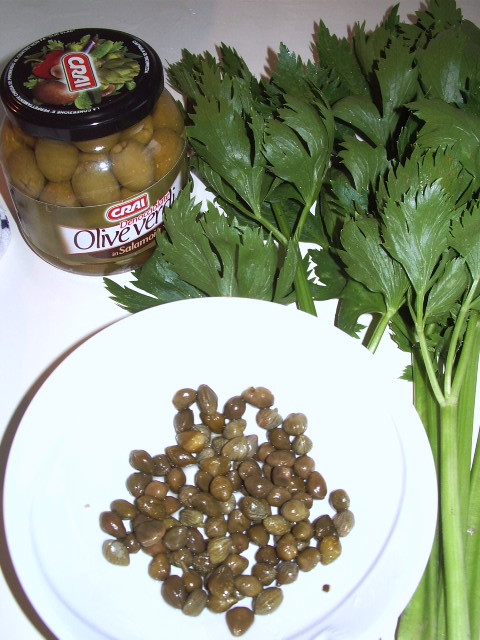 3-Verdure bollite: togliere le foglie al sedano, lavarlo e tagliarlo a pezzetti da 1 cm circa. Metterlo a bollire per una mezz’oretta in acqua leggermente salata. A fine cottura verificare che ci sia ancora un po’ d’acqua. Se troppa, eliminarne in modo che ne rimanga mezzo bicchiere. Aggiungere capperi e olive denocciolate a pezzetti. Lasciar cuocere 5 minuti e spegnere.