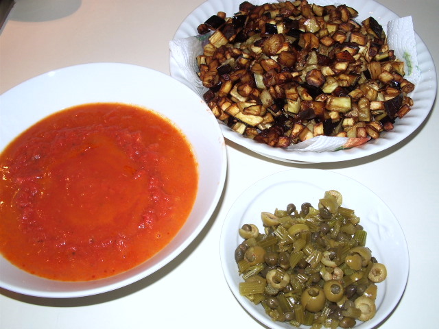 Si procede preparando separatamente tre pentole: -salsa di pomodoro -melanzane fritte -verdure bollite Si otterranno questi piatti che verranno poi uniti e mescolati: