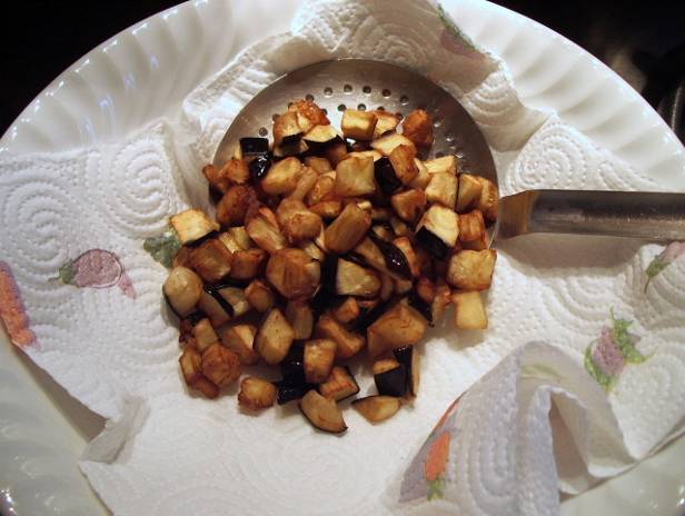 Quando le melanzane sono rosolate, toglierle e farle asciugare sulla carta da cucina. Completare la cottura di tutte le melanzane.