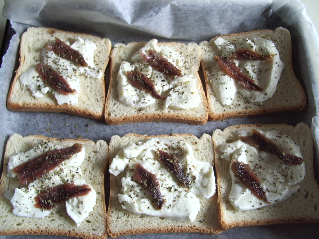 1-Preparare sulla carta da forno le fette di pan carré o di pane normale, aggiungere il pizzico di sale. Adagiare su ognuna la fetta di mozzarella. Posare i pezzi di acciuga e cospargere un po’ di origano. Mettere in forno caldo a 180° per pochi minuti, cioè fino a quando la mozzarella si scioglie.