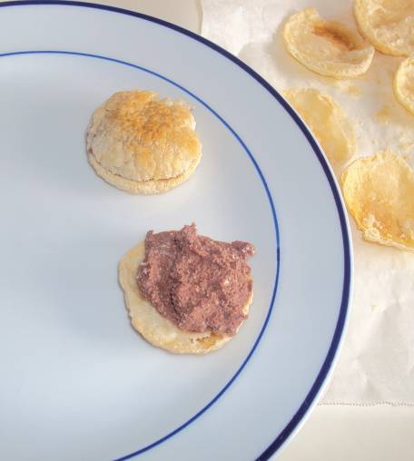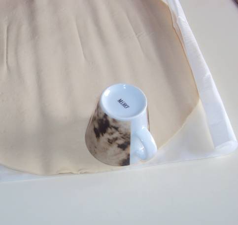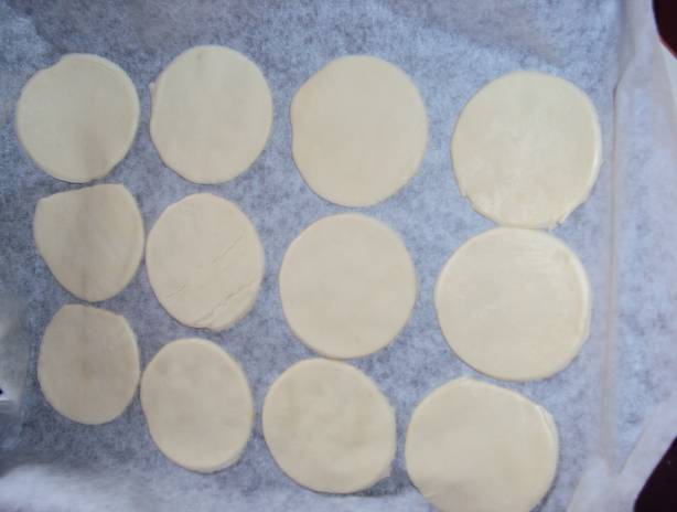 1-Con l’aiuto di una tazzina da caffè ritagliare molto vicini dei dischi dalla pasta sfoglia. Mettere sulla leccarda un foglio di carta da forno e posarvi i dischetti. Scaldare il forno a 180 gradi.