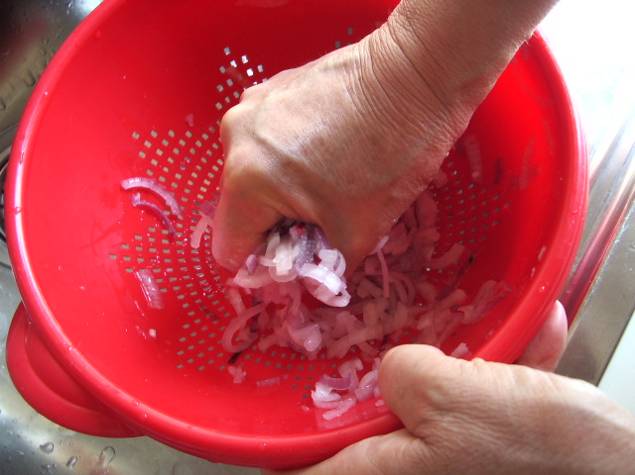 Per preparare la cipolla è meglio proteggersi gli occhi con occhiali. Tagliare la cipolla e metterla in uno scolapasta. Coprirla con un abbondante cucchiaio di sale (anche 2 cucchiai se la cipolla è grande). Strizzarla con la mano con forza per ammorbidirla. Farà anche una schiuma che colerà sotto. Dopo qualche minuto sciacquare bene la cipolla per liberarla del sale. Strizzarla bene e metterla su un piattino. Nel salare il pesce ricordarsi che la cipolla è già stata salata.