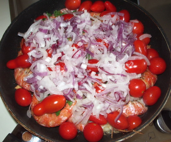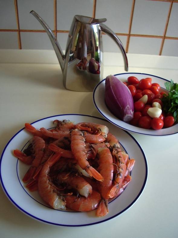 Ingredienti per 2 persone 400 g di gamberoni senza testa (oppure 500 g se completi) 250 g di pomodorini da sugo 1 cipolla di Tropea 3 spicchi di aglio 1 mazzetto di prezzemolo 4 cucchiai di olio extravergine di oliva Sale e pepe