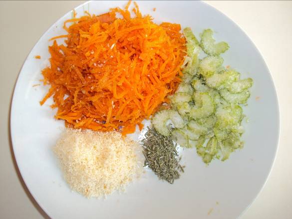 1-Mondare, lavare, asciugare la carota e grattugiarla o tagliarla a julienne; allo stesso modo ridurre a pezzetti il sedano e gli aghetti del rosmarino.