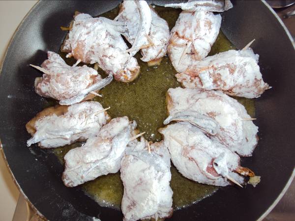 4-Passare ogni involtino nella farina. Scaldare l’olio in una padella antiaderente e mettere gli involtini a rosolare.