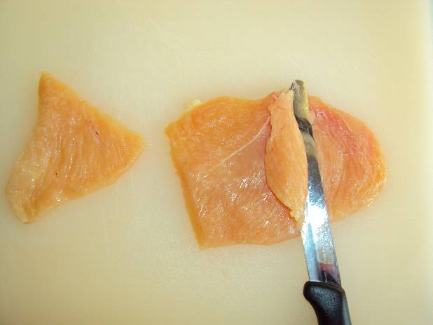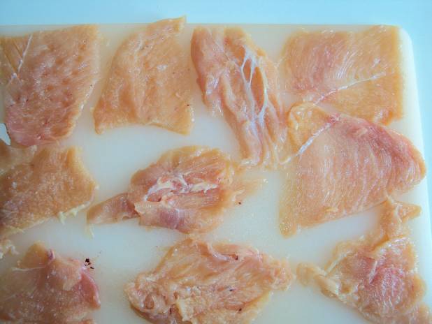 2-Taglire il petto di pollo a fettine sottili e a pezzi di circa 7 cm di lato. Mettere il sale.