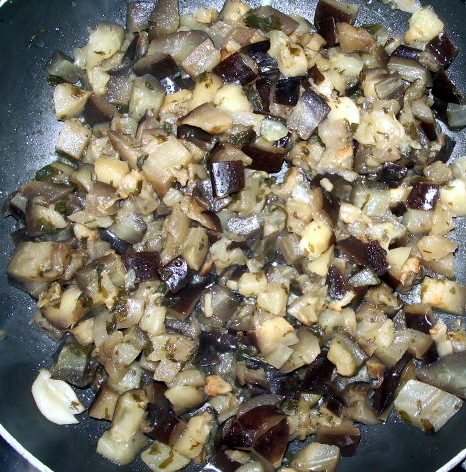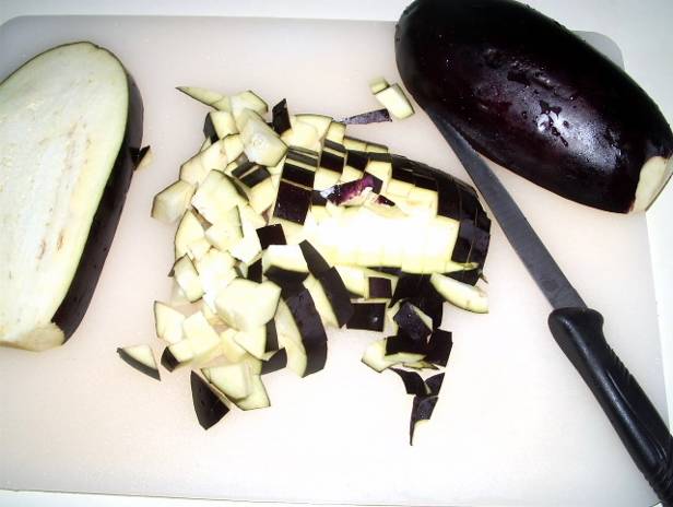 1-Eliminare il picciolo, lavare e asciugare la melanzana e tagliarla prima a fette di circa 2 cm e poi a cubetti. Se si teme che la melanzana sia troppo amara, si possono mettere i cubetti nell’acqua coperti da una manciata di sale per un’ora; poi vanno lavati bene e asciugati in un canovaccio.