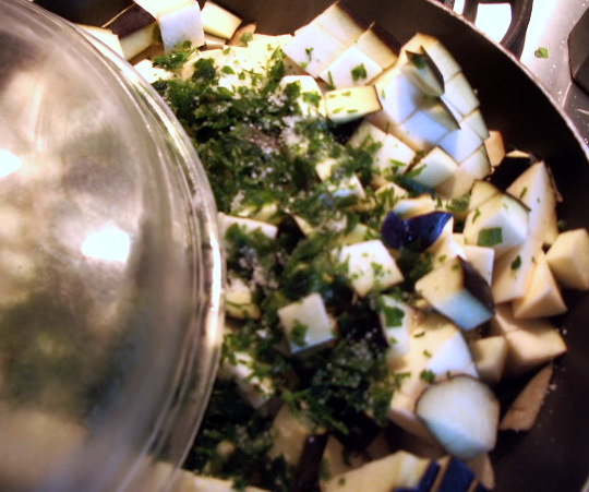 3- Lasciar soffriggere poco e poi allontanare la padella dal fuoco e aggiungere i cubetti di melanzana (in questo modo non si fanno schizzi). Unire il prezzemolo tagliato e il sale. Coprire e lasciar cuocere per mezz’ora a fuoco molto basso rimestando spesso.