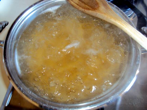 Portare l’acqua della pasta a bollire, unire la pasta e il sale.