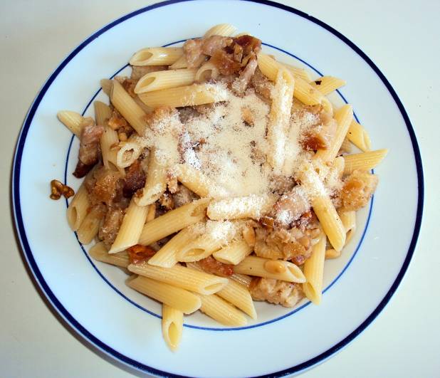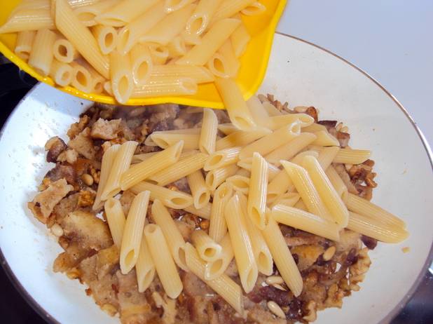 Unire gherigli, pinoli e pane, sale e pepe. Far cuocere per qualche minuto, poi aggiungere 1 tazzina di acqua della pasta. Tenere da parte ancora una tazzina di acqua della pasta se questa risultasse troppo asciutta.