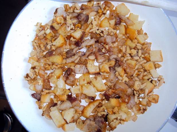 Intanto tagliare la pancetta, sminuzzare i gherigli e ridurre il pane a cubettini. In una padella antiaderente versare l’olio e l’aglio a pezzetti. Quando è rosolato unire i pezzetti di pancetta e farli rosolare fino a quando diventano bruni e lasciano uscire il grasso.