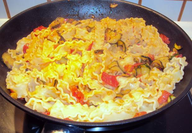 Quando la pasta è cotta scolarla e versarla nella padella. Mescolare e servirla calda col parmigiano.