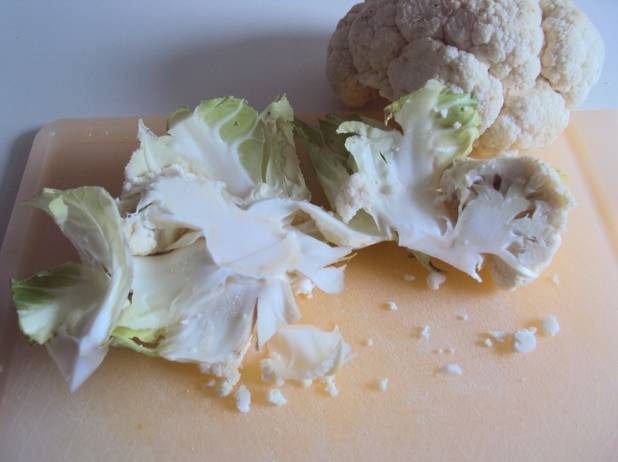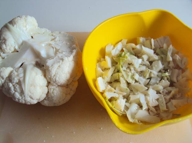 Questa ricetta mostra un modo per utilizzare la parte di base del cavolfiore fresco. Togliere foglie, torsolo e qualche fiore del cavolfiore e tagliarli a pezzetti avendo cura di eliminare le parti più sporche di terra. Lavarli e scolarli.