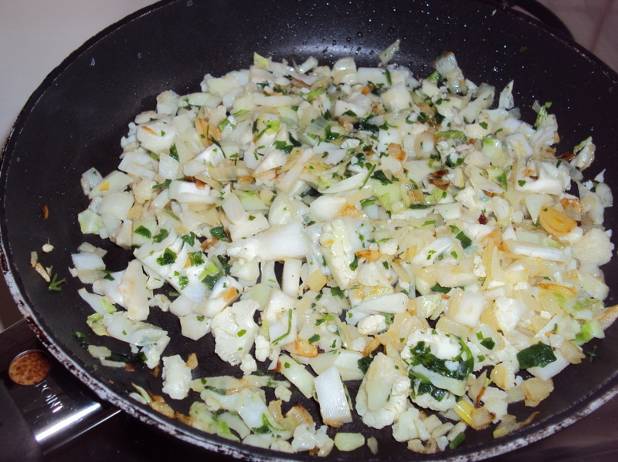 Preparare il soffritto con olio, cipolla e aglio a pezzettini. Quando sono rosolati unire i pezzetti di cavolfiore, il prezzemolo, sale e pepe e rigirare per qualche minuto. Versare un po’ di brodo o di acqua e far cuocere per un quarto d’ora a fuoco basso col coperchio.