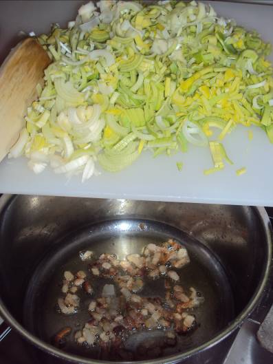 2-Preparare in una casseruola l’olio con il lardo a pezzetti (oppure solo l’olio) e appena rosolato unire il porro tagliato, sale e pepe. Lasciar insaporire a fuoco basso per un quarto d’ora, poi aggiungere il vino e mezzo bicchiere d’acqua; lasciar cuocere per una decina di minuti coperto e sempre a fuoco basso, rigirando.