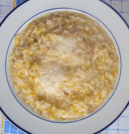 Ingredienti per 2 persone 2 porri 3 tazzine (da caffè) di riso 4 cucchiai di Parmigiano Mezzo bicchiere di vino bianco Mezzo litro di brodo o mezzo dado 1 noce di burro 2 cucchiai di olio extravergine di oliva oppure 1 cucchiaio di olio extr. + 50 g di lardo/pancetta Sale e pepe