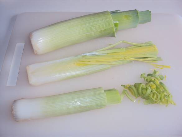 1-Tagliare la parte finale del porro, evntualmente togliere la prima foglia se brutta. Lavare bene sotto l’acqua corrente; tagliare a metà per lungo e lavare internamente scostando le foglie. Tagliare a pezzetti: potrebbe avere ancora un po’ di terriccio, perciò lavarlo ancora.