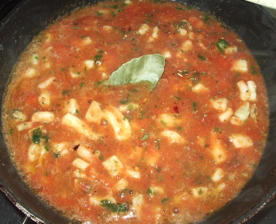 Ingredienti per 2 persone: 200 g di anelli di totano anche congelati 180 g di spaghetti Qualche cucchiaio di polpa di pomodoro (pelati o passata) 2 acciughe 2 spicchi di aglio 1 foglia di alloro Prezzemolo Peperoncino 2 cucchiai di olio extravergine di oliva Sale