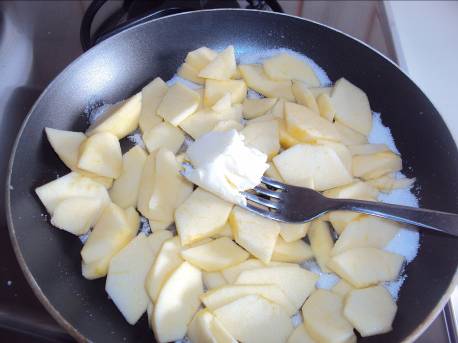 2-Sbucciare e tagliare a pezzetti le mele. Sciogliere lo zucchero semolato in un tegame e poi aggiungere i pezzetti di mela e l’altra noce di burro. Far cuocere per qualche minuto.
