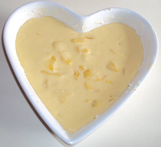 3-Frullare o sbattere a mano le uova intere con la buccia grattugiata del limone e i due cucchiai di farina, meglio se setacciata per evitare i grumi. Aggiungere il latte sempre frullando e ancora un cucchiaio di farina setacciata. Se la farina non contiene già il lievito, è il momento di metterlo. Unire il composto del tegame con le mele calde, amalgamare e poi versare il tutto nello stampo.