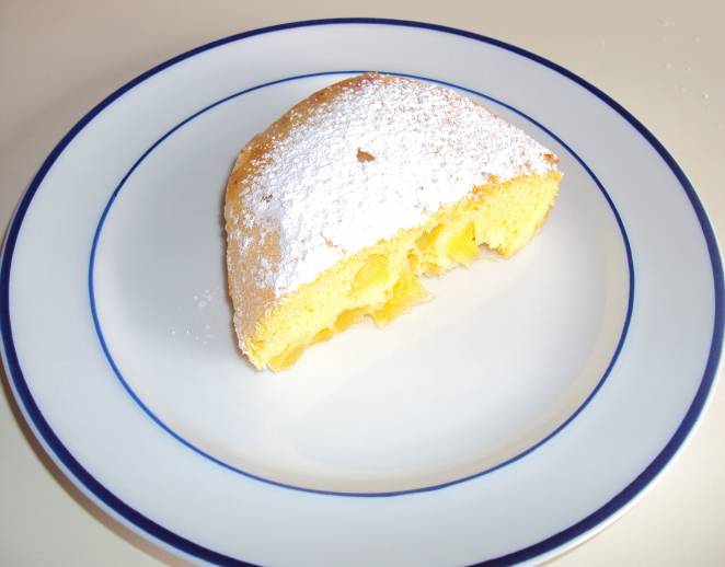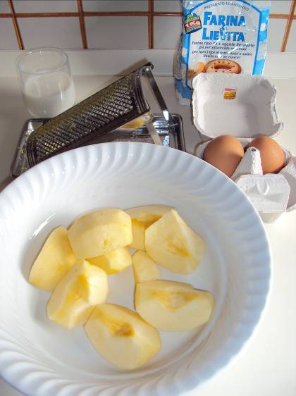 Ingredienti per 4 persone 1 mela renetta grossa o 2 piccole 2 uova 2 cucchiai di zucchero semolato 1 cucchiaio di zucchero a velo 2 noci di burro 4 cucchiai colmi di farina (se farina già con lievito, non aggiungere il lievito/ingrediente successivo) Mezzo cucchiaino di lievito istantaneo per dolci Mezzo bicchiere di latte Scorza grattugiata di un limone