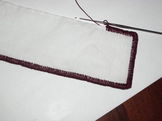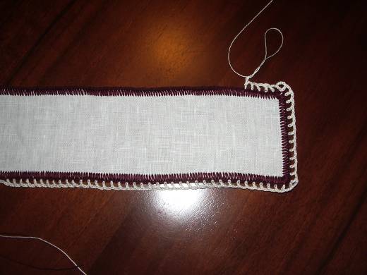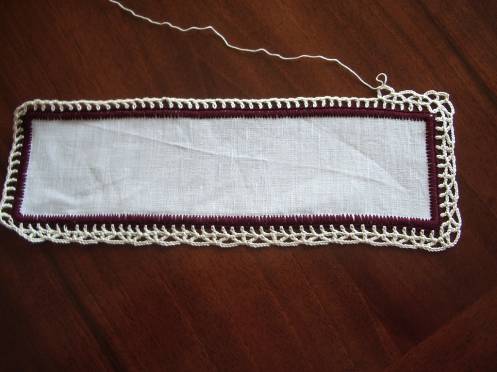 2-Sul diritto del lavoro: avviare un punto basso che faccia da punto festone tutt’intorno. Attenzione negli angoli a nascondere la stoffa con qualche punto basso in più. Se non si fanno dei punti in più il lavoro tira e gli angoli si sollevano.